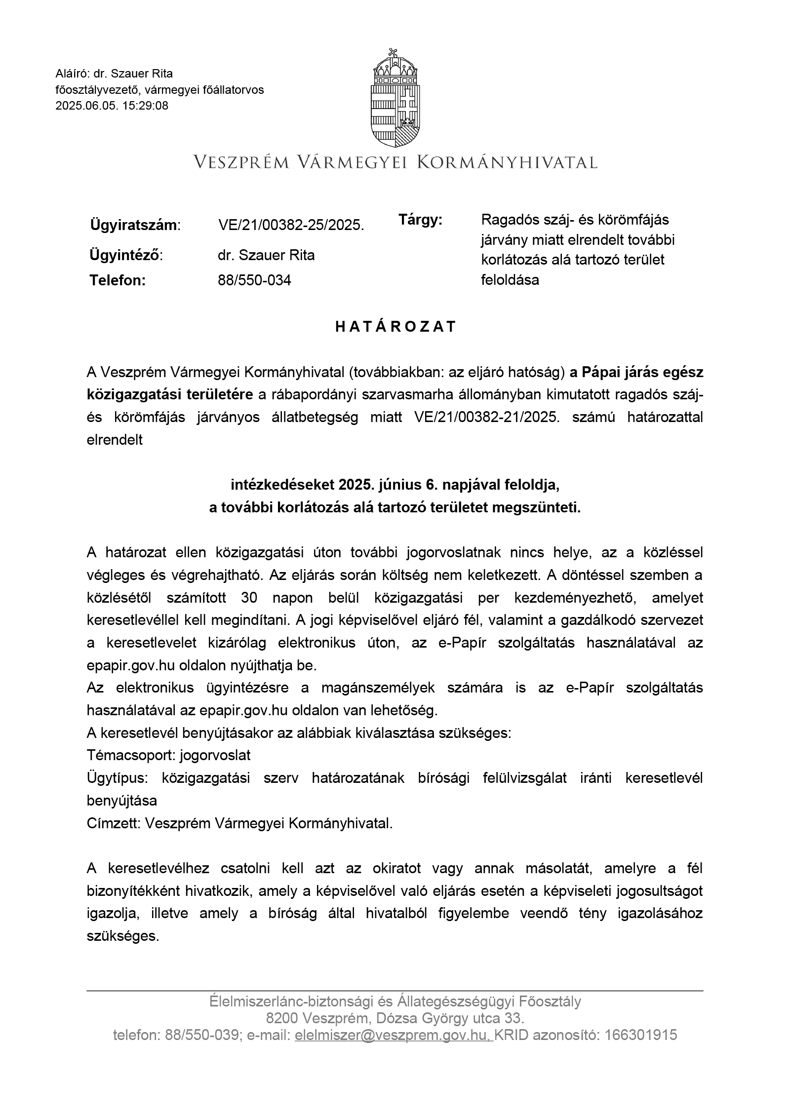 Kiadó hatóság: Veszprém Vármegyei Kormányhivatal, Élelmiszerlánc-biztonsági és Állategészségügyi Főosztály